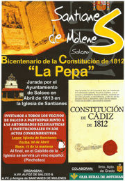 El próximo día 19 de Abril del 2013, será el Bicentenario de la Jura de la Constitución Española “La Pepa”, creo que debe de ser un gran día, para poder celebrarlo, todos/as los vecinos de Santianes de Molenes, como todos/as los vecinos de la Parroquia, al igual que los pueblos que pertenecían en aquella época al Ayuntamiento de Salcedo, pues solo pensar que todos nuestros antepasados, en este día hace 200 años estaban presentes en dicho acto en la Iglesia Parroquial para la jura de la Constitución, tiene una gran importancia histórica.